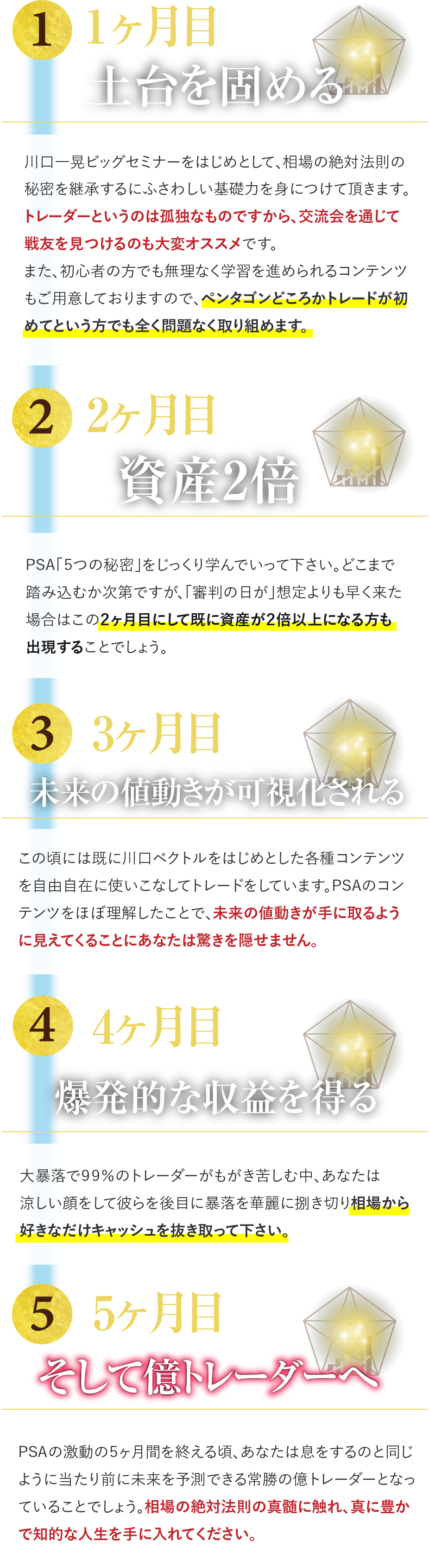 PSAでは、トレードに関する「直接的な勝ち方」をお教えいたしますので逆に言いますとそれ以外の余分な知識は不要です。あなたを最短コースで「億トレーダー」へと導くことが目的ですので一切の遠回りを排除して進めて行きます。どうぞご安心ください。